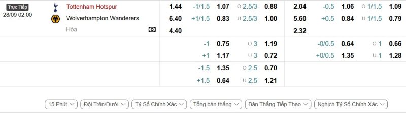 - Kèo tỷ số bóng đá hiệp 1: Tottenham Hotspur 1-0 Wolverhampton Wanderers