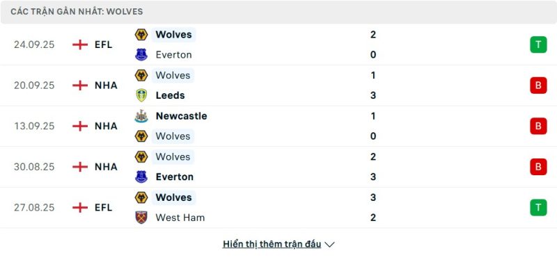 5 trận gần nhất của Wolverhampton Wanderers: W-L-L-L-W