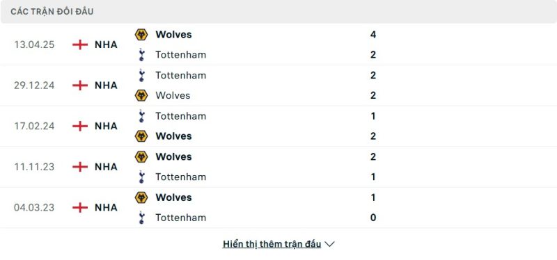Thành tích đối đầu của Tottenham Hotspur vs Wolverhampton Wanderers