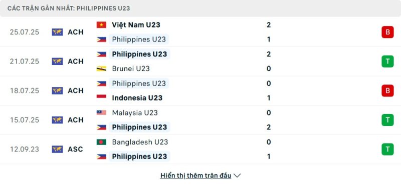 Thống kê phong độ gần đây U23 Philippines vs U23 Thái Lan