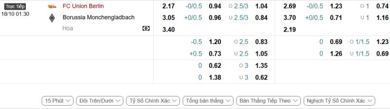 Bảng Tỷ lệ kèo bóng đá Union Berlin vs Borussia Mönchengladbach