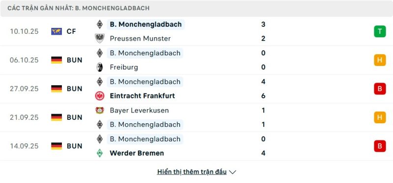 5 trận gần nhất của Borussia Mönchengladbach: W-D-L-D-L