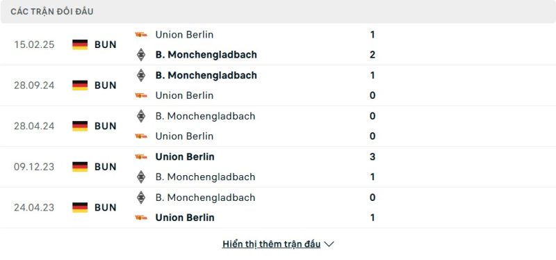 Thành tích đối đầu của Union Berlin vs Borussia Mönchengladbach