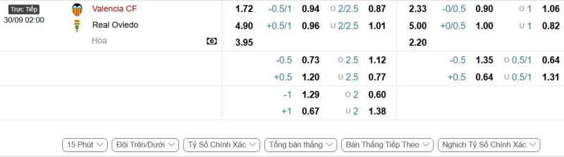 - Kèo tỷ số bóng đá hiệp 1: Valencia 0-0 Real Oviedo