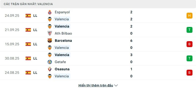 Valencia hiện đang đứng ở vị trí thứ 11 trên bảng xếp hạng La Liga sau 6 vòng đấu với 8 điểm. Họ có được 2 chiến thắng, 2 trận hòa và 2 trận thua, ghi 8 bàn và để lọt lưới 10 bàn. Trong những trận gần đây, Valencia đã có màn trình diễn tích cực trước Athletic Club với chiến thắng 2-0 và cũng hòa 2-2 với Espanyol, qua đó cho thấy khả năng cạnh tranh ổn định. Tuy nhiên, thất bại 0-6 trước Barcelona đã phơi bày sự bất ổn nơi hàng thủ. Dẫu vậy, đội bóng này luôn có khả năng tạo bất ngờ trước các đối thủ tầm trung.