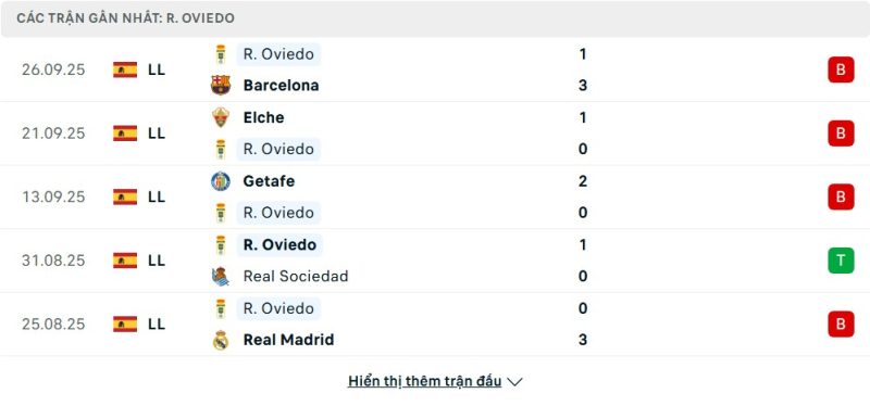 5 trận gần nhất của Real Oviedo: L-L-L-W-L
