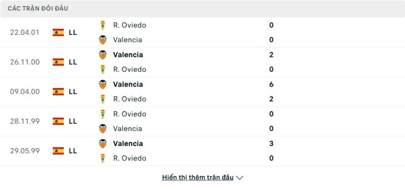 Thành tích đối đầu của Valencia vs Real Oviedo
