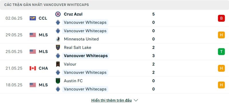 5 trận gần nhất của Vancouver Whitecaps: L-D-W-D-D