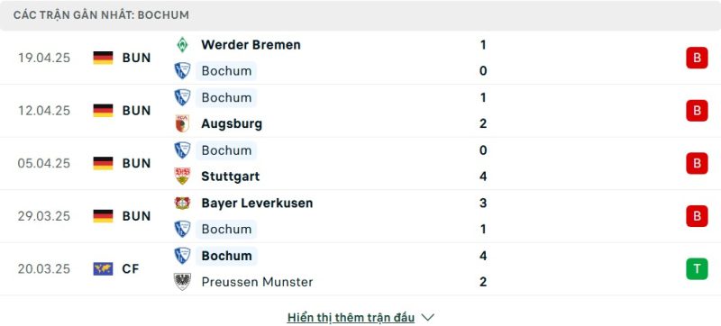 5 trận gần nhất của VfL Bochum: L-L-L-L-W