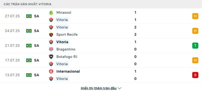 Phong độ gần đây của Vitória đang ở mức trung bình. Họ hiện đang đứng thứ 15 trên bảng xếp hạng với 17 điểm sau 17 trận đấu. Trong 5 trận gần nhất trên mọi đấu trường, Vitória có 1 chiến thắng, 3 trận hòa và 1 trận thua. Các kết quả này cho thấy đội bóng có khả năng cầm hòa trước những đối thủ mạnh như Mirassol hay Botafogo RJ, nhưng lại thiếu đi sự bứt phá để giành trọn vẹn 3 điểm.