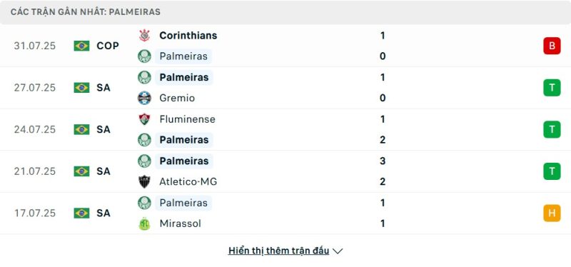 5 trận gần nhất của Palmeiras: L-W-W-W-D