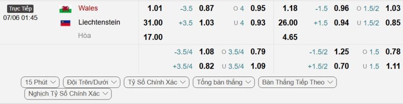 Trong hiệp 1, Xứ Wales sẽ là đội chủ động hơn trong việc chiếm lĩnh không gian và dâng cao tấn công. Trước hàng thủ thiếu chắc chắn và thường xuyên mắc lỗi vị trí của Liechtenstein, đội chủ nhà được dự báo sẽ sớm tìm được bàn mở tỷ số. Mức kèo tài xỉu mà nhà cái niêm yết là 1.75 với tỷ lệ cho tài là 1.03, tỷ lệ cho xỉu là 0.85, người chơi nên đặt niềm tin vào cửa xỉu cho hiệp đấu này.